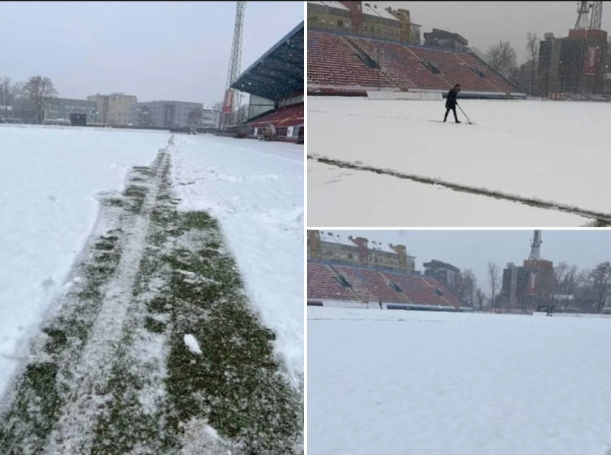 Teren stadiona u Banjaluci je prekriven snijegom, a organizatori su već počeli sa čišćenjem i pokušat će da dovedu teren u što bolje stanje pred početak današnje utakmice.