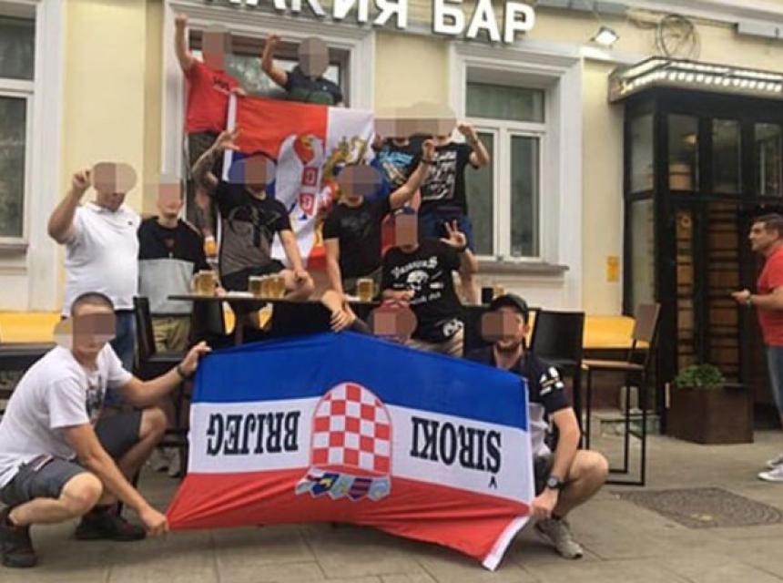 Kakonavode ruski medijii, navijači iz Zemuna “skinuli” su zastavu hrvatskim pristalicama iz Širokog Brijega, a onda se i sa njom slikali ispred jednog lokala u Rusiji.