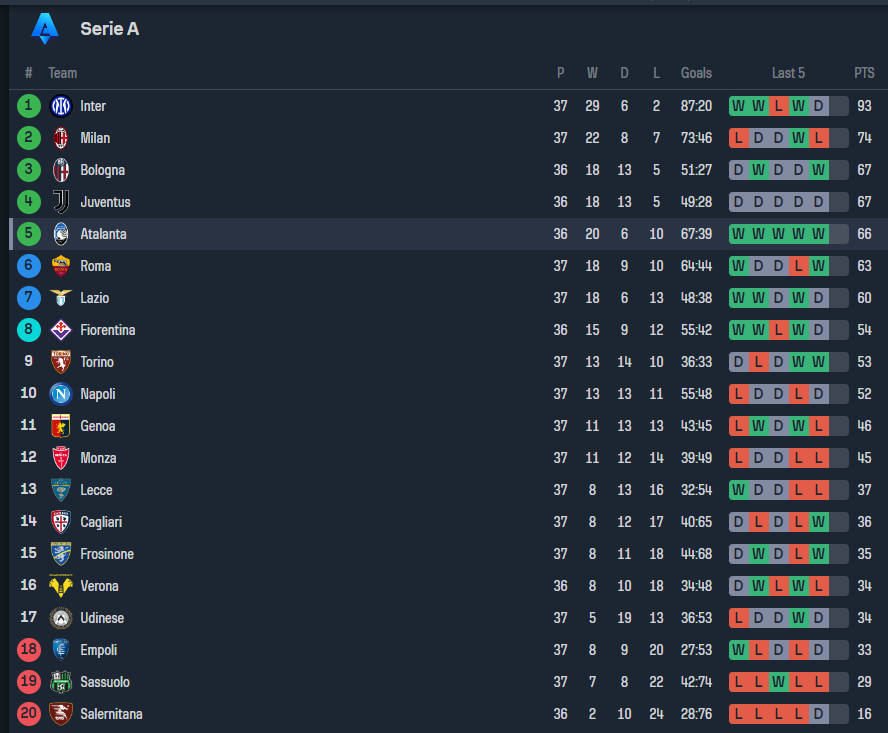 Već se zna da je prvak Italije Inter, a u Ligu prvaka idu Milan, Bologna, Juventus i Atalanta. Iz lige su ispali Sassuolo i Salernitana.