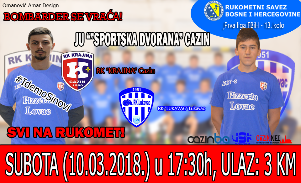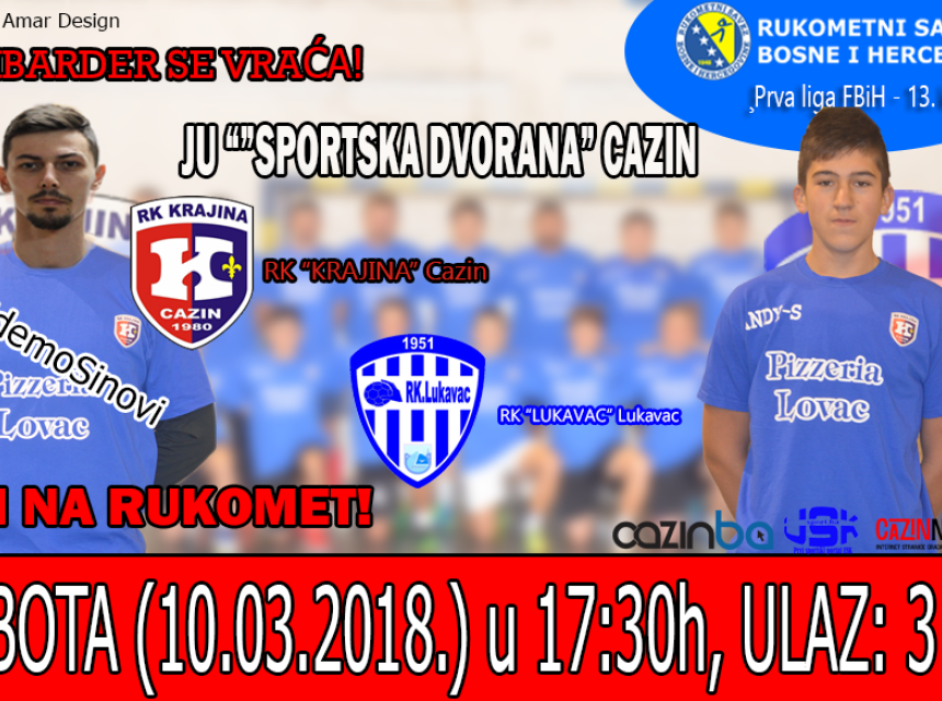 Utakmica RK Krajina - RK Lukavac igra se u subotu 10.03.2018 s početkom od 17:30 u Sportskoj dvorani Cazin.