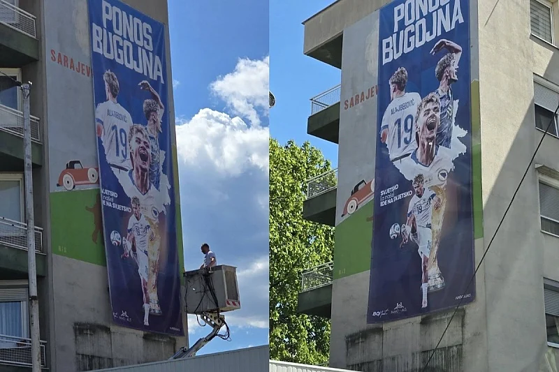 Fotografije portala Bugojno Danas prikazuju bilboarad koji se proteže duž cijele bočne fasade jedne stambene zgrade, a Alajbegović je dominantno prikazan u prepoznatljivom dresu reprezentacije s brojem 19, u trenucima velikog slavlja.
