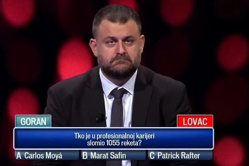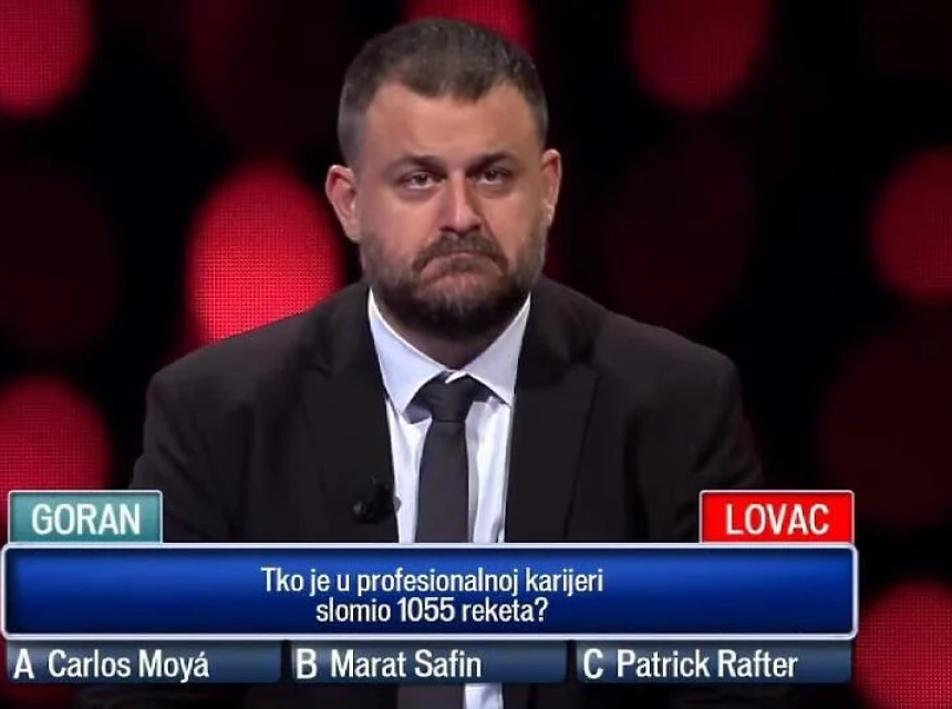 Šezdesetogodišnji penzioner Goran iz Klisa je dobio peto pitanje koje je glasilo: "Ko je u profesionalnoj karijeri slomio 1.055 reketa?".
