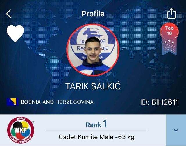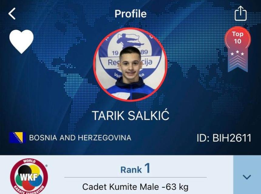 Tarik Salkić, član Karate kluba „Regeneracija“ iz Velike Kladuše, osvojio je jučer nekoliko minuta iza podneva prvu zlatnu medalju na Evropskom prvenstvu koje se održava u Pragu. Salkić je rezultatom 4:1 savladao svog protivnika iz Portugala u kategoriji borbe – kadeti – 63kg.