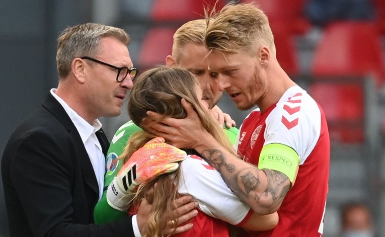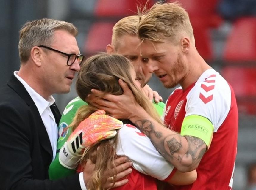 Zadržali su je da ne ode do mjesta gdje su oživljavali Christiana. Prvi od igrača Danske do nje je stigao Kasper Schmeichel. Čvrsto ju je zagrlio, a ubrzo je došao i Simon Kjaer, igrač koji je prvi priskočio u pomoć Eriksenu i spriječio da se uguši do dolaska liječničkog tima.