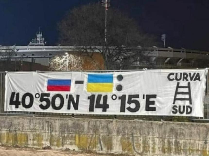 Transparent koji su Veronini ultrasi postavili na ogradu ispred stadiona svoje ekipe prikazuje kordinate Napulja, aludirajući na to kako bi Rusi, koji ovih dana vrše invaziju na Ukrajinu, mogli precizno bombardovati Napulj dalekometnim projektilima.