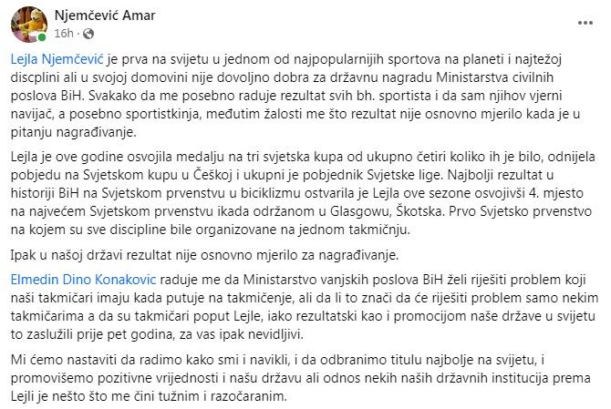 Njemčević je naveo kako ga boli nepravda što najbolja bh. biciklistkinja nije dobila nagradu. Da naglasimo, u komentaru je naveo da nema ništa protiv Muzaferije, da za nju navijaju i bodre je, ali da je činjenica da je Lejla zaslužila nagradu.
