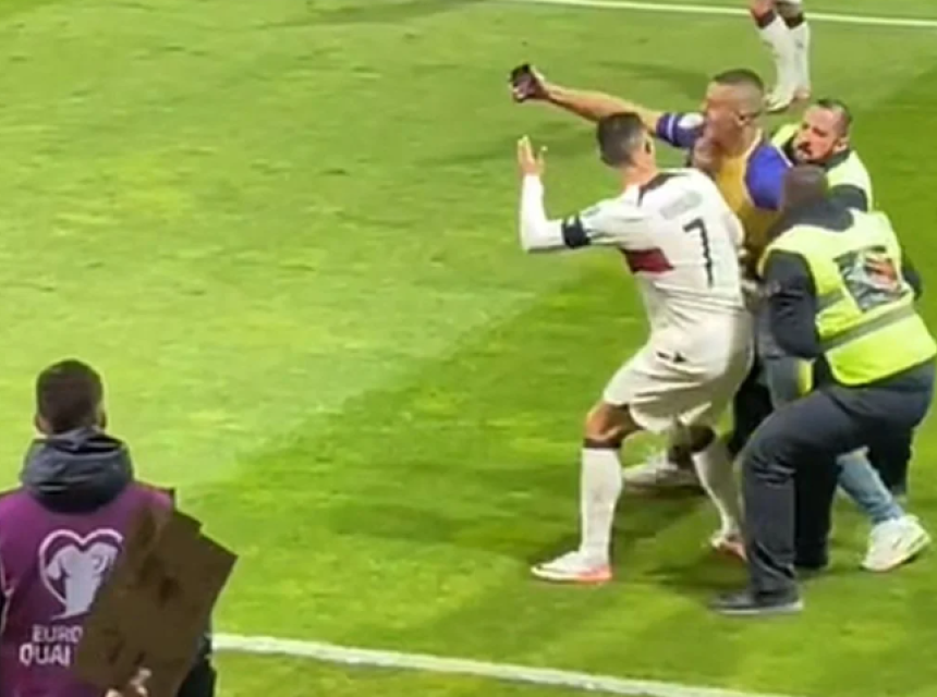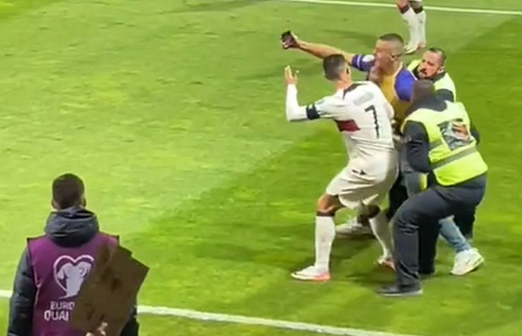 Imao je navijač blizak susret sa Ronaldom, te se na prvu činilo da se Portugalac povrijedio jer je zadobio udarac u nogu.
