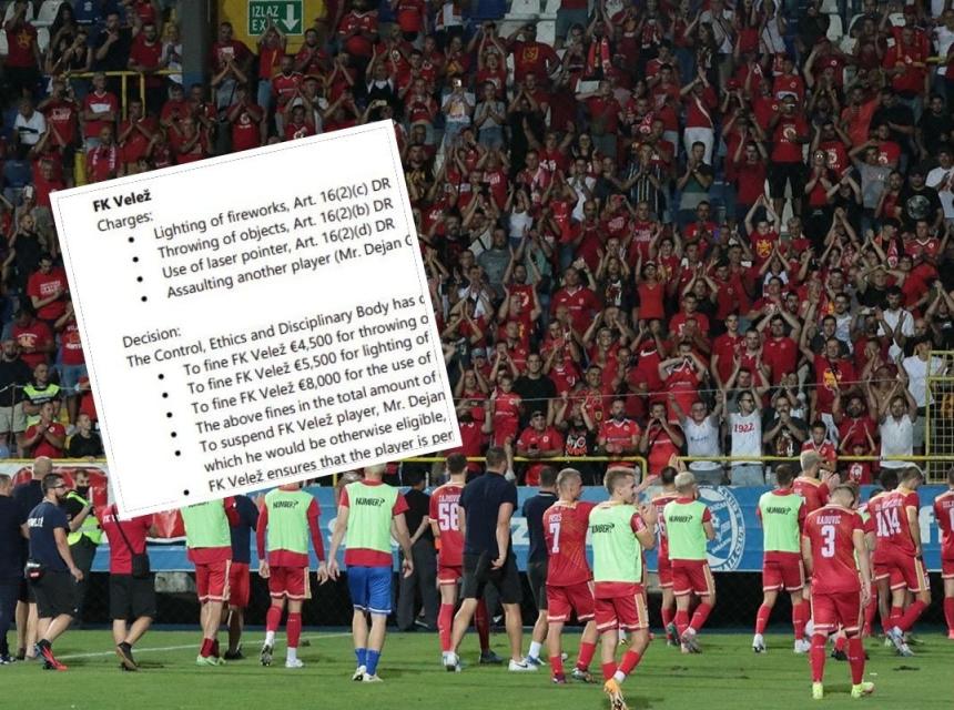 Naime, na sjednici održanoj 23. septembra Disciplinska komisija je kaznila Velež sa 4.500 eura zbog ubacivanja predmeta u teren, zatim 5.500 eura zbog paljenja baklji te 8.000 eura zbog upotrebe lasera.