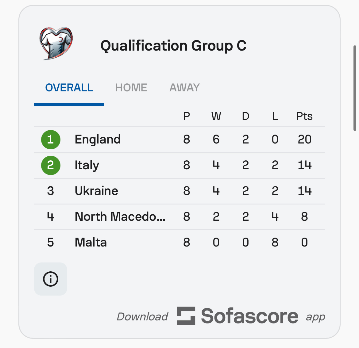 Ukrajinci su imali šansu da se plasiraju direktno na Euro, ali su za takvo nešto morali pobijediti Italiju. Iz grupe C će na Evropsko prvenstvo Engleska, koja je bila prva, te Italija.