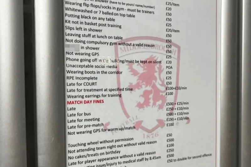 Nogometaši Middlesbrougha se suočavaju s kaznama zbog velikog broja stvari, od toga što nisu donijeli tortu na rođendan, ali i bizarnih razloga kao što je mokrenje pod tušem.