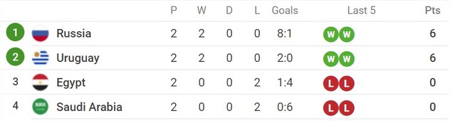 Rusi su jučer u drugom kolu grupe A savladali Egipat rezultatom 3:1, a danas je Urugvaj nadigrao Saudijsku Arabiju rezultatom 1:0.