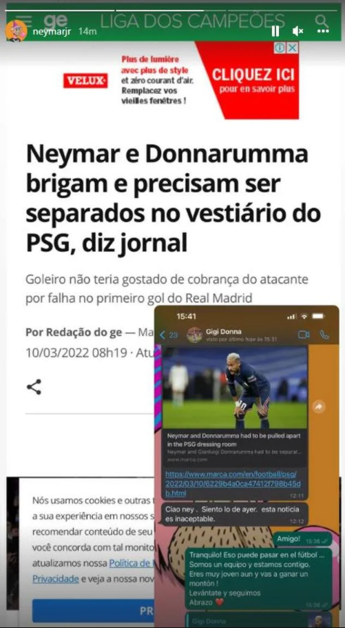 "Ćao Ney. Žao mi je zbog jučer. Ova vijest je neprihvatljiva", napisao je Donnarumma uz vijest s Marce u kojoj se navodi da je između spomenutih igrača došlo do fizičkog sukoba.
