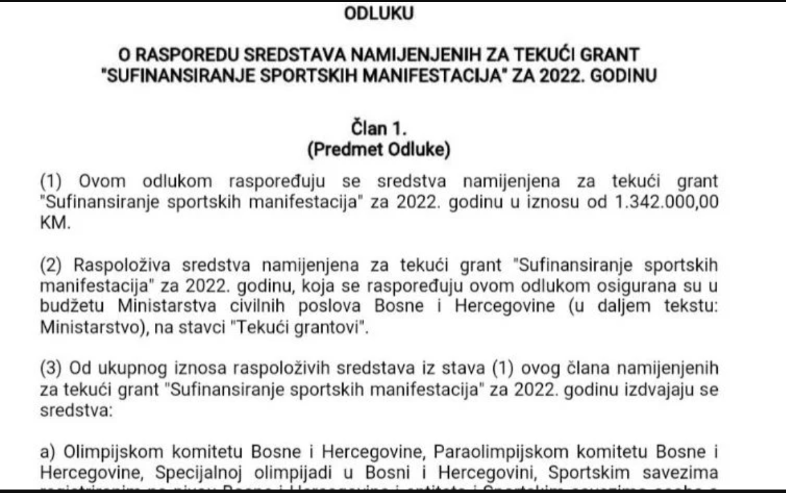 "Ministarstvo civilnih poslova BiH jutros je objavilo Odluku o rasporedu sredstava namijenjenih za tekući grant "Sufinansiranje sportskih manifestacija" za 2022.