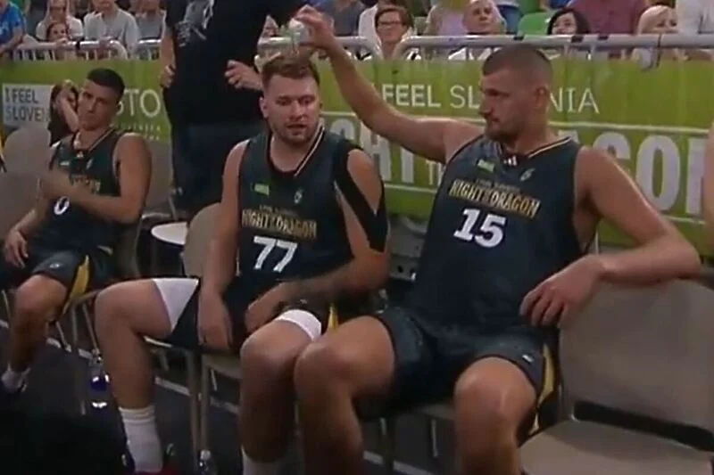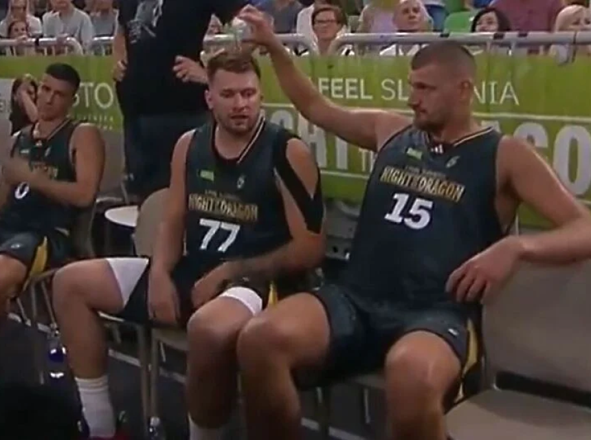 Tako je Jokić lupio Dončića flašom po glavi nakon čega ga je i ispolivao vodom na što se Slovenac samo nasmijao.