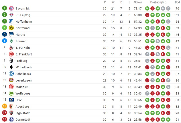 Werder je u sjajnoj utakmici savladao Ingolstadt u gostima rezultatom 4:2. Na prvi gol čekalo se do 32. minute kada je Lezcano doveo domaće u vodstvo na asistenciju Tisseranda. Ipak, u sudijskoj nadoknadi prvog poluvremena Kruse je poravnao rezultat iz penala. Na isti način, sa bijele tačke, gol je postigao i Ingolstadt u 62. minuti, a precizan je bio Gross. Danas sjajni Kruse svojim drugim golom u 81. minuti prvo je poravnao rezultat, a onda je tri minute prije kraja meča doveo Werder u vodstvo. Njemački reprezentativac na tome se nije zaustavio pa je u 94. minuti postigao i svoj četvrti gol za konačnih 2:4.