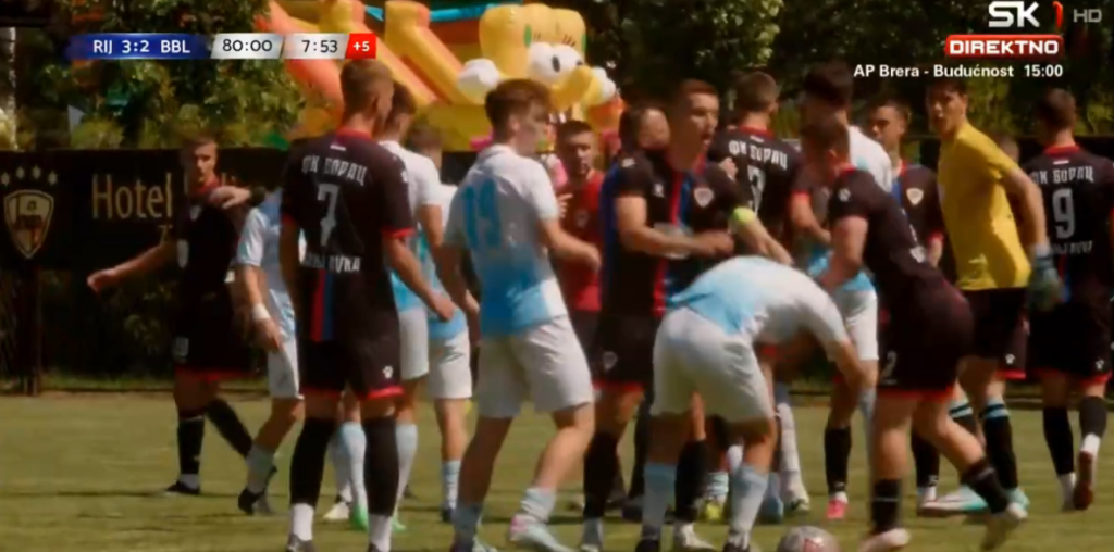 U sudijskoj nadoknadi vremena došlo je i do tuče na terenu. Došlo je do koškanja dvojice igrača, pa su se onda uključili i ostali. Morao je na teren utrčati i trener Zoran Dragišić da smiri strasti, a dok je on to radio, Nemanja Rendić je udario jednog fudbalera Rijeke koji je ostao da leži na zemlji.