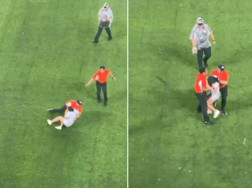 Iako još uvijek nikome nije jasno zbog čega je djevojka utrčala na teren, redar ju je na sredini terena sačekao da mu se ona približi, a onda je brutalno oborio na travu.