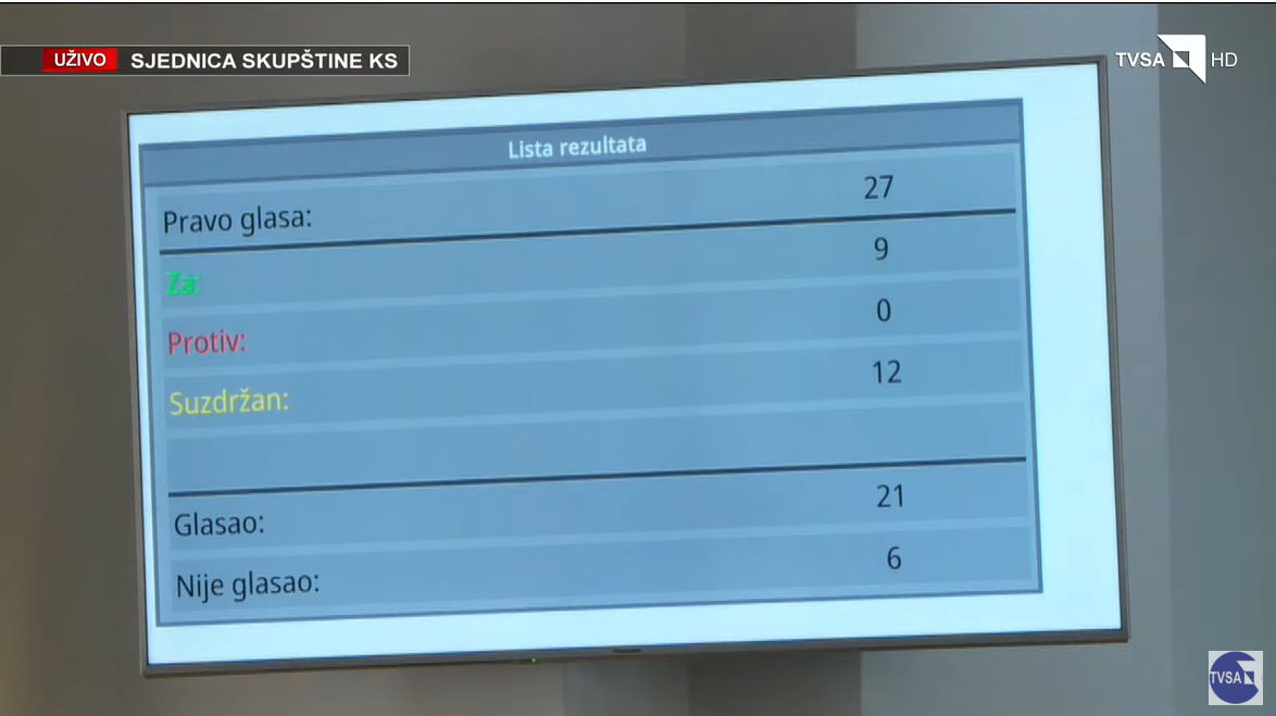 - Za je glasalo devet, protiv ništa, suzdržanih 17. Konstatujem da Skupština nije prihvatila ovu inicijativu - konstatovao je nakon pojedinačnog izjašnjavanja Elvedin Okerić, predsjedavajući Skupštine KS.