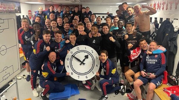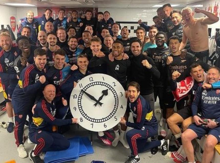 Oleksandr Zinčenko je na Instagramu objavio fotografiju iz svlačionice na kojoj igrači Arsenala i stručni štab poziraju s velikim replikom sata koji je nekad stajao na krovu starog stadiona Highbury.