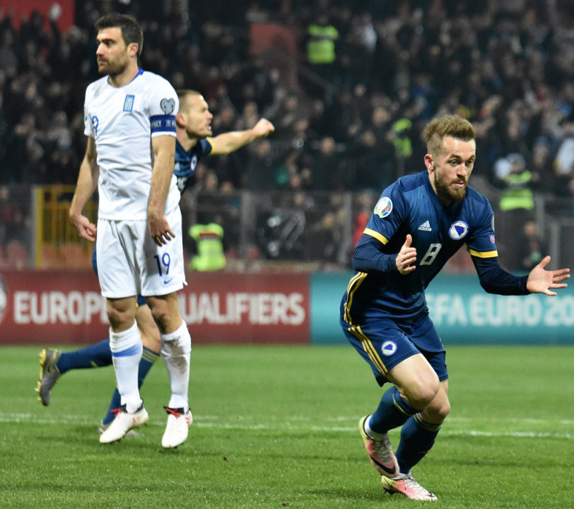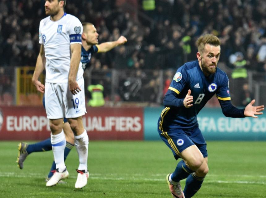 Minutu kasnije Miralem Pjanić je dobio direktan crveni karton zbog jednog oštrog starta. U 68. minuti Sead Kolašinac imao je veliku priliku, ali je pogodio samo spoljnji dio mreže. U 77. minuti Samaris je šutirao, ali je Šehić dobro intervenirao. Grčka je do boda došla u 85. minuti kada je rezervista Kolovos matirao Šehića za 2:2 i veliko razočarenje domaćih navijača.
