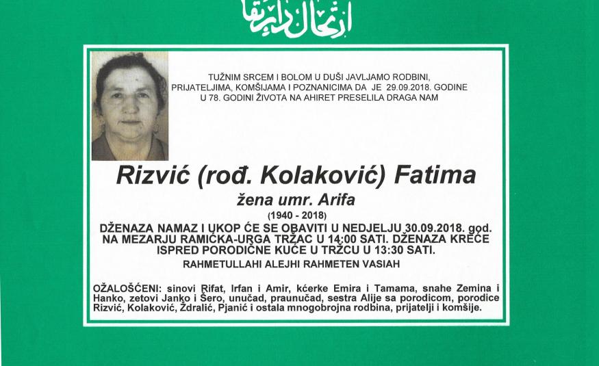 Na Ahiret preselila Rizvić (rođ.Kolaković) Fatima