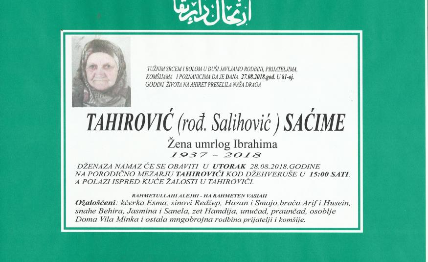 Na Ahiret preselila Tahirović (rođ. Salihović) Saćime