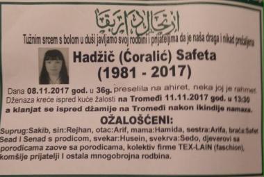 PRERANA SMRT: U 36. godini na Ahiret preselila Hadžič ( rođ. Ćoralić) Safeta