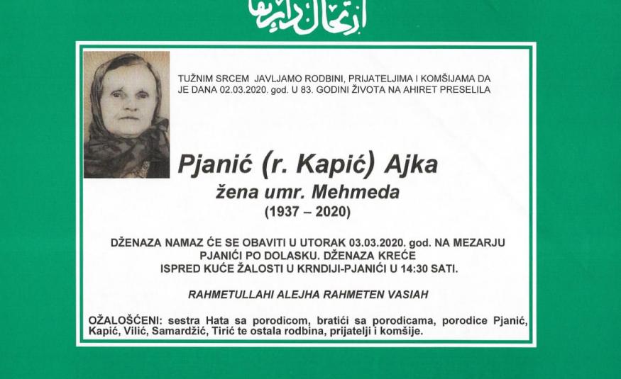 Na Ahiret preselila Pjanić (Kapić) Ajka žena umr. Mehmeda