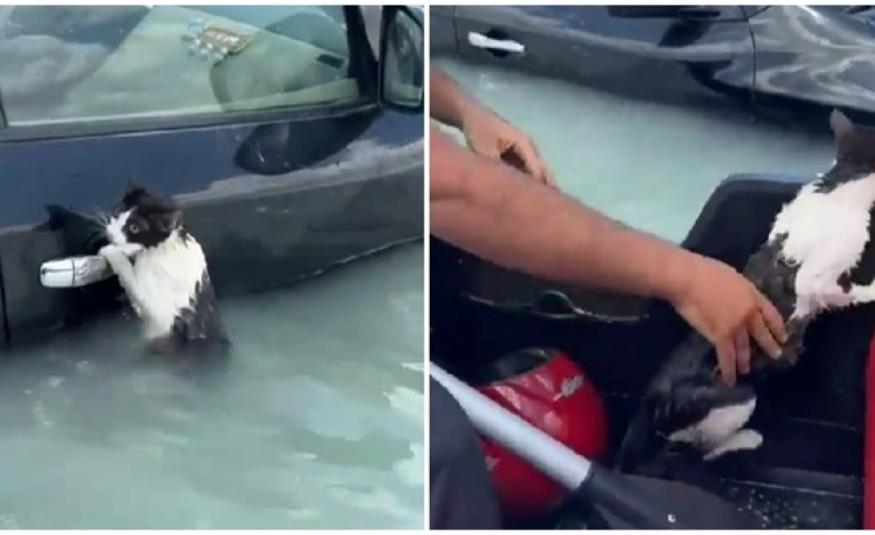 U poplavljenom Dubaiju mačka se čvrsto držala za kvaku auta. Spasili je dobri ljudi