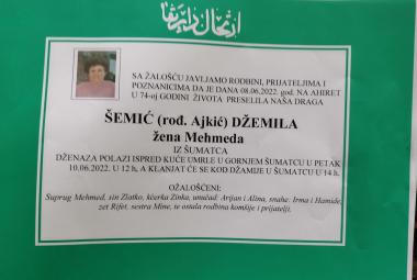 Na Ahiret preselila Šemić (rođ. Ajkić) Džemila - žena Mehmeda