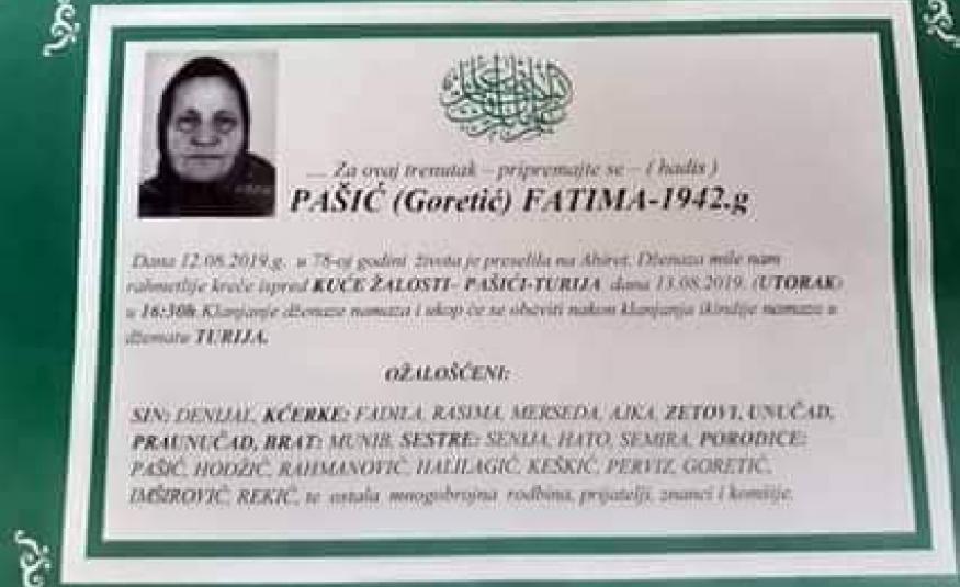 Na Ahiret preselila Pašić (Goretić) Fatima