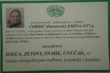 Na Ahiret preselila Ćordić (Duranović) Emina