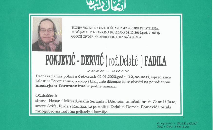 Na Ahiret preselila Ponjević-Dervić (rođ. Delalić) Fadila