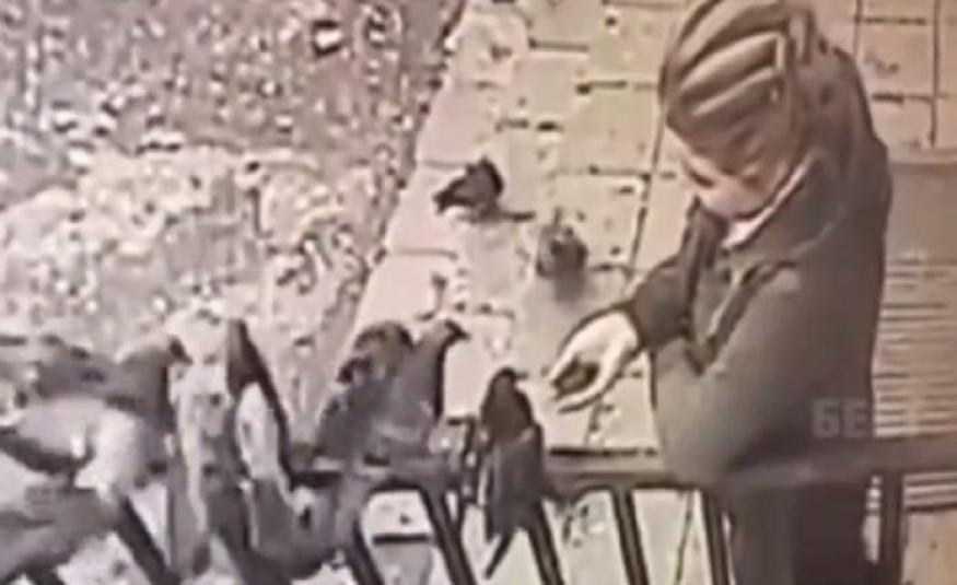 Žena na snimku hrani golubove, a onda grabi jednog i unosi ga u kuću