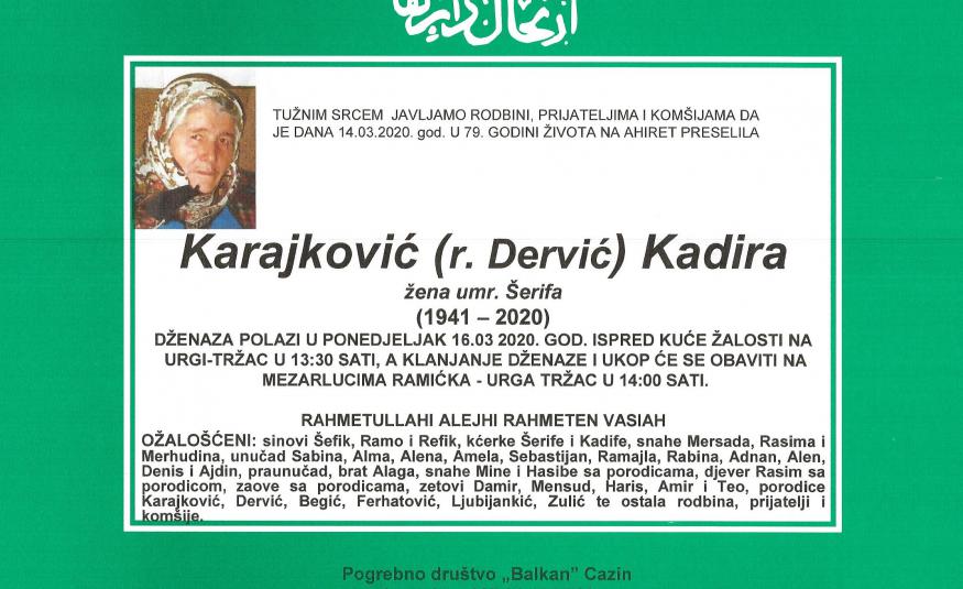 Na Ahiret preselila Karajković (Dervić) Kadira žena umr. Šerifa