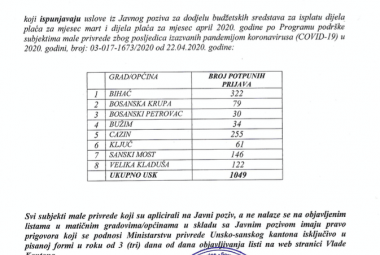 Lista subjekata male privrede sa područja USK-a koji ispunjavaju uslove Javnog poziva za dodjelu budžetskih sredstava