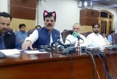 Pakistanski političar s mačijim ušima i brkovima u prenosu konferencije