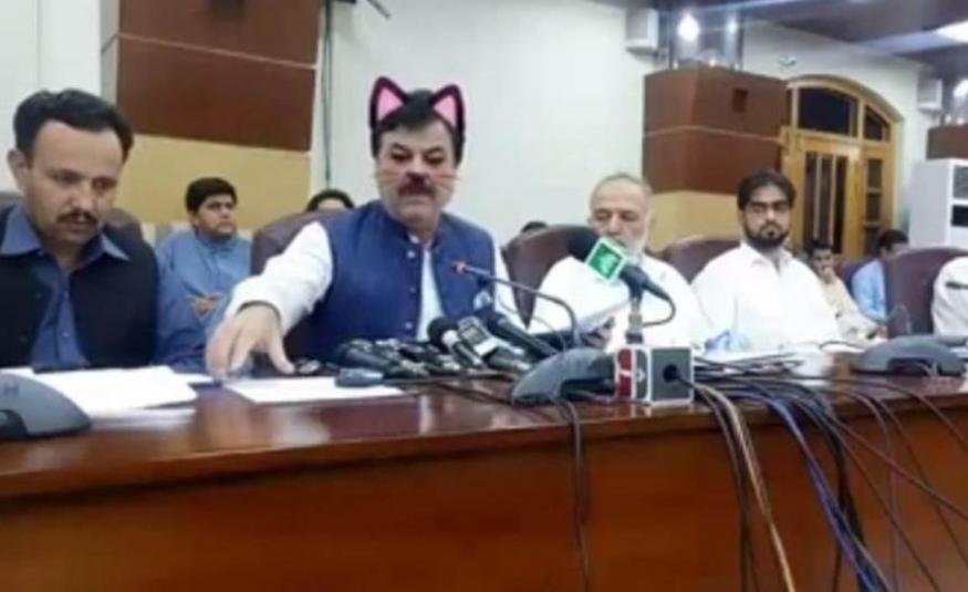 Pakistanski političar s mačijim ušima i brkovima u prenosu konferencije