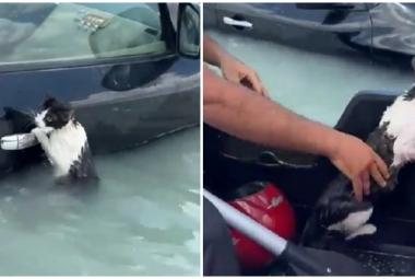 U poplavljenom Dubaiju mačka se čvrsto držala za kvaku auta. Spasili je dobri ljudi
