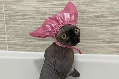 Simpatična mačka bez dlake koja se kupa s ružičastom kapom oduševila je internet