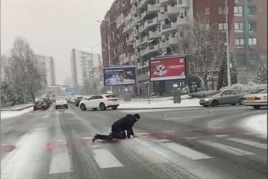 Opreza nikad dosta: Muškarac u Skoplju zbog poledice puzao preko pješačkog prelaza