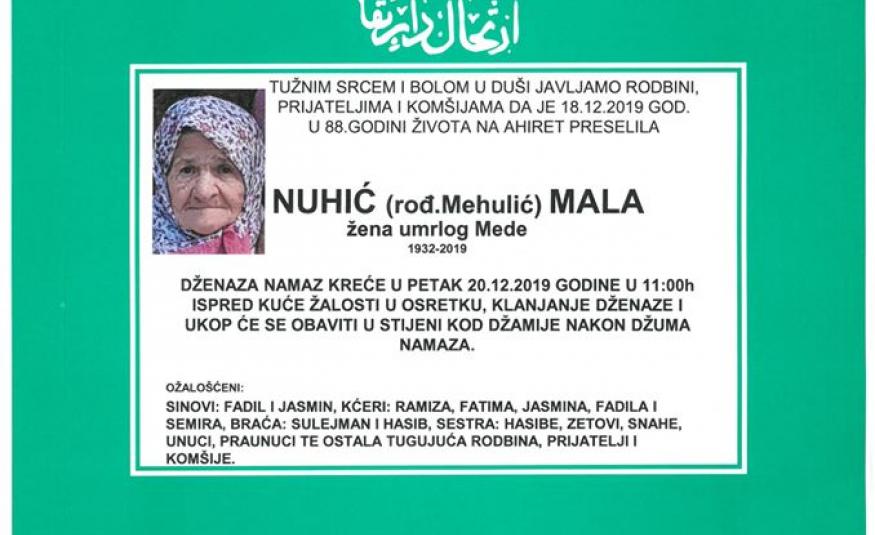 Na Ahiret preselila Nuhić (rođ. Mehulić) Mala