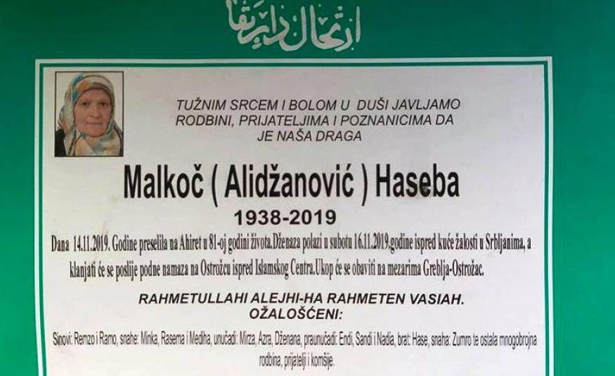 Na Ahiret preselila Malkoč (rođ. Alidžanović) Haseba