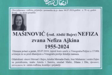 Na Ahiret preselila Mašinović (rođ. Abdić Bajre) Nefiza zvana Nefiza Ajkina