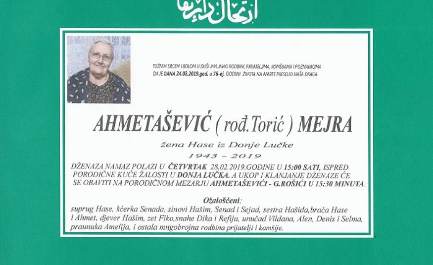 Na Ahiret preselila Ahmetašević (rođ.Torić) Mejra