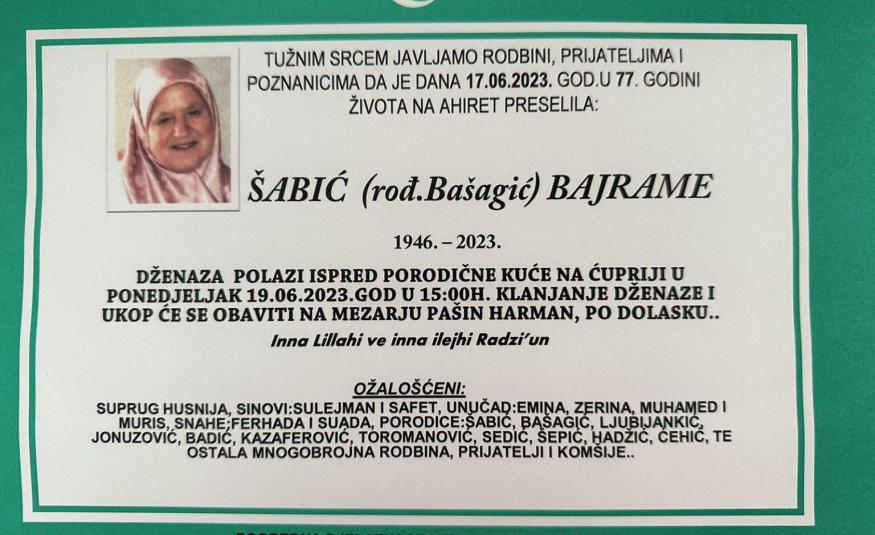 Na Ahiret preselila Šabić (rođ. Bašagić) Bajrame