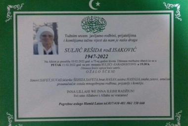 Na ahiret preselila Suljić Rešida rođ. Isaković