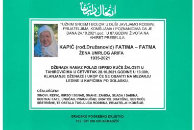 Na ahiret preselila Kapić (rođ. Družanović) Fatima- Fatma