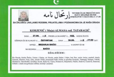 Na Ahiret preselila Korjenić (Muja) Almasa rođ. Tataragić