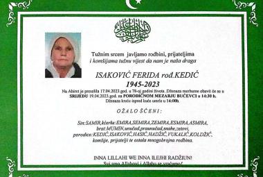 Na Ahiret preselila Isaković Ferida rođ. Kedić